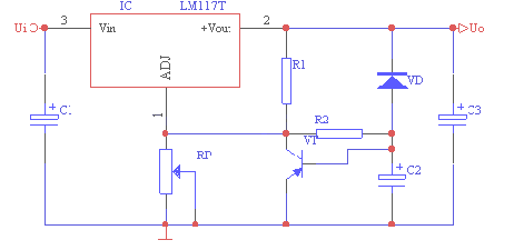 CW117还可以用于软启动电源电路,如下图所示。刚接通输入电源时,C2上无电压,VT导通将RP短路,稳压电源输出电压Uo=1.2V。随着C2的充电,VT逐步退出导通状态,Uo逐步上升,直至C2充电结束,VT截止,Uo达最大值。启动时间的长短由R1、R2和C2决定。VD为C2提供放电通路。